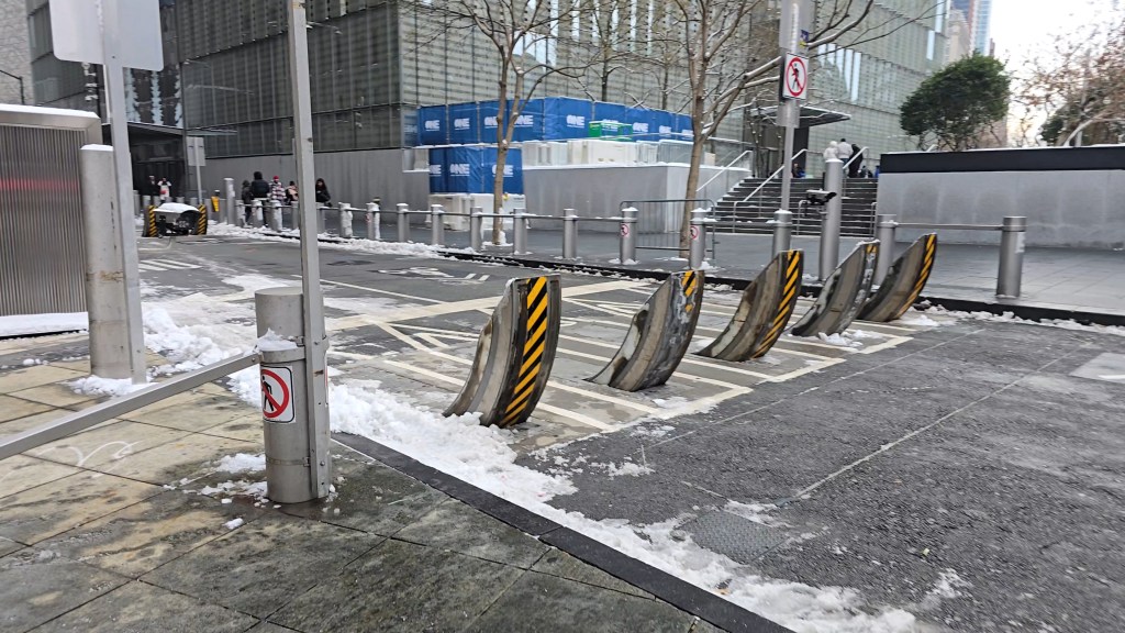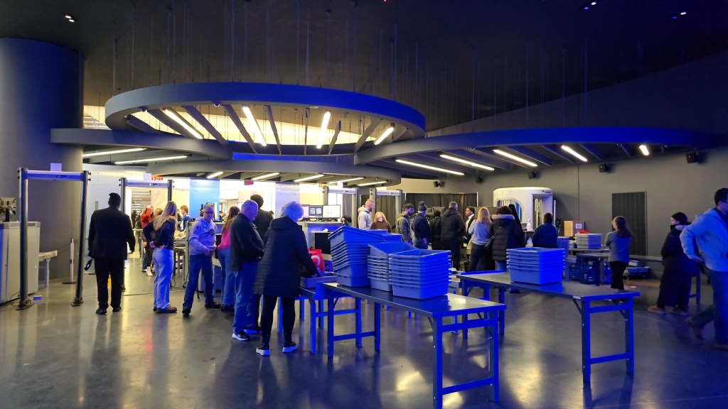 When we got there, the security presence was intense. You can’t even park near the building — there are retractable street bollards and barriers designed to protect the area. Officers and scanners are everywhere, and you’ll go through metal detectors and X-ray screening before you head toward the elevators.